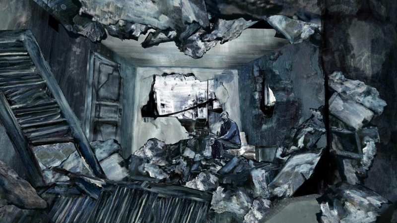 第一個(gè)房間,戰(zhàn)爭(zhēng)中疲于奔命的老人在一處只剩殘?jiān)珨啾诘膹U墟中翻出了一臺(tái)黑膠唱片機(jī),裝上了自己在外面搜索到的唱片。廢墟外防空警報(bào)、轟炸聲此起彼伏,廢墟內(nèi)卻洋溢著和緩、靜穆、甚至有些浪漫的旋律,氣氛迥異的兩個(gè)環(huán)境形成了鮮明的對(duì)比。老人在發(fā)現(xiàn)我的窺視后沒(méi)有任何反應(yīng)或神情變化,竟自顧地躺下安然睡去。