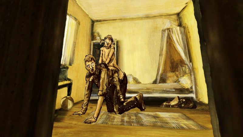 第二個(gè)房間,疲憊的父親下班回家卻沒(méi)有發(fā)現(xiàn)女兒的身影,他敲敲地板、又看向窗外,作焦急狀。當(dāng)他像往常一樣趴在地板上學(xué)馬兒叫時(shí),藏在衣柜中的女兒突然跳出,二人哈哈大笑,玩起了騎馬游戲。然而他們突然“看”到了我,膽小的女兒驚慌地趕忙又躲入衣柜,而父親則做出防御姿態(tài),卷了卷衣袖,神情嚴(yán)肅地在我面前“砰”地關(guān)上了門(mén)。