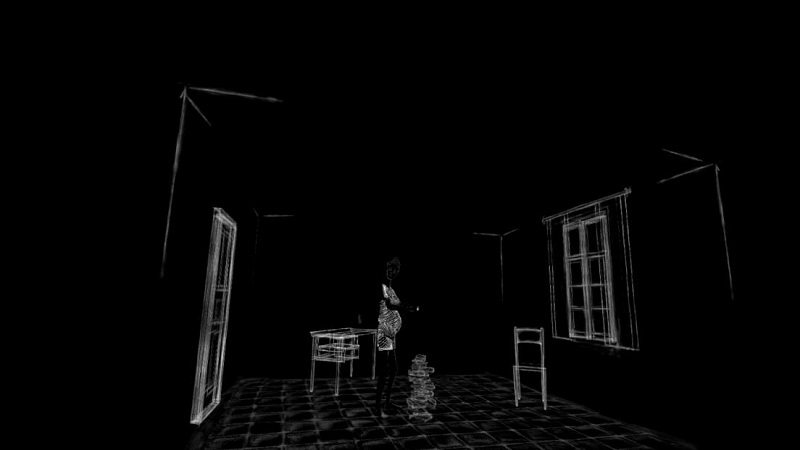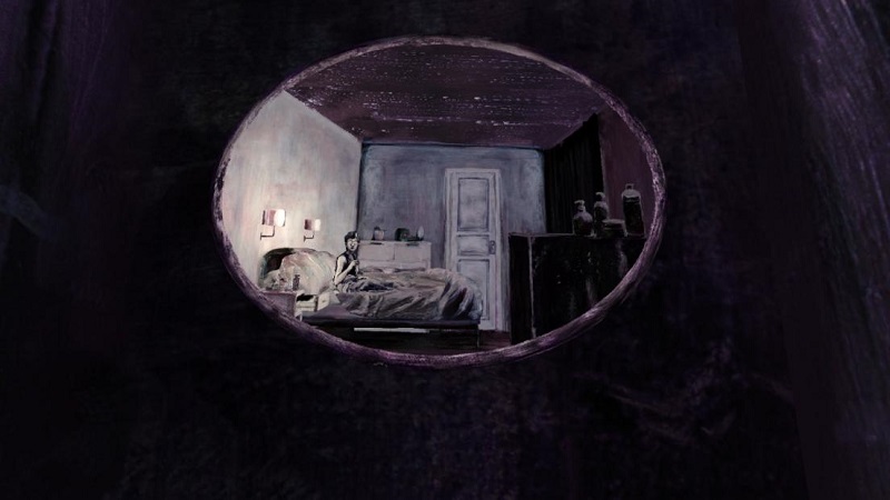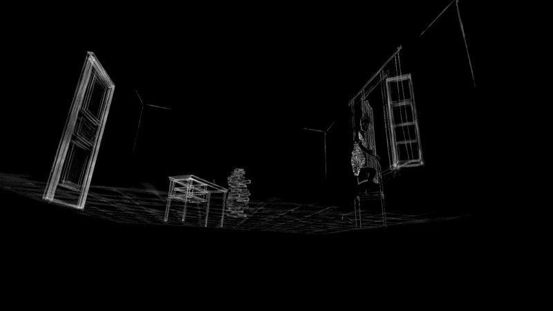整部影片可以視作兩個(gè)部分,第一部分對(duì)上述兩種交互進(jìn)行了拆分:觀(guān)眾首先會(huì)降到一個(gè)互動(dòng)區(qū),互動(dòng)區(qū)的四面墻分別設(shè)置了一扇門(mén)、一個(gè)衣柜、一扇窗和一個(gè)壁爐,分別對(duì)應(yīng)四個(gè)不同的空間。通過(guò)體感交互穿過(guò)上述空間便可進(jìn)入四個(gè)不同的房間,在那里即可以一個(gè)窺視者的身份窺探他人的隱私生活。來(lái)自臺(tái)下的窺視被片中人突然識(shí)破,由此獲得直擊內(nèi)心的情感體驗(yàn)。在第一部分中,觀(guān)眾只是一個(gè)普通的旁觀(guān)者,雖然可以自由的調(diào)焦和走動(dòng),但無(wú)法“上臺(tái)”置身并參與他人的生活。