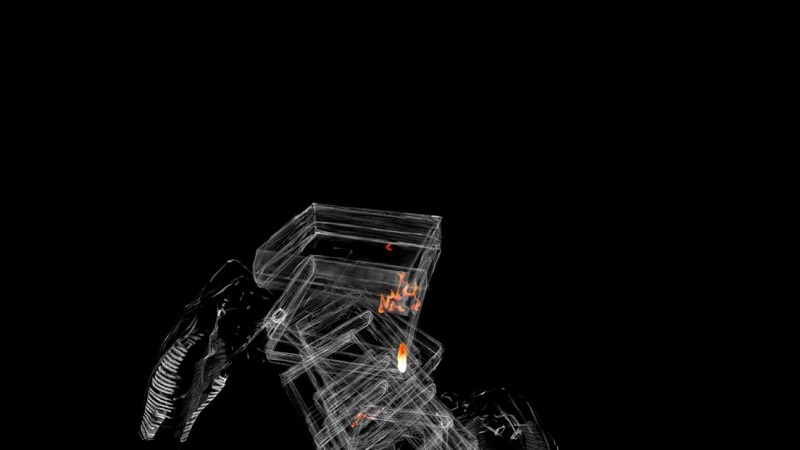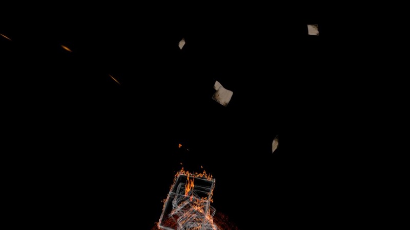 在第二部分中,導(dǎo)演又嘗試將兩種交互簡(jiǎn)單糅合,留下大量的想象空間。極權(quán)下,偷偷藏書(shū)的黑人孕婦,在聽(tīng)到急促的砰砰敲門(mén)聲后選擇自殺,在跳下窗前的最后一眼,她意味深長(zhǎng)地望向了我,之后便義無(wú)反顧地躍出窗外。隨后我發(fā)現(xiàn)自己站在了房中間,手里多了一盒火柴,門(mén)外是愈發(fā)激烈的砸門(mén)聲。緊接著我劃著火柴幫那位黑人孕婦燒掉了禁書(shū),隨著火勢(shì)逐漸兇猛,窗外的一陣狂風(fēng)瞬間將燃燒的千百書(shū)頁(yè)吹到了空中,看著漫天火光,耳旁還響起了激烈急促的音樂(lè)聲,我內(nèi)心的緊張和恐懼瞬間爆發(fā),幾乎難以分清虛境與現(xiàn)實(shí),震驚難以言表。