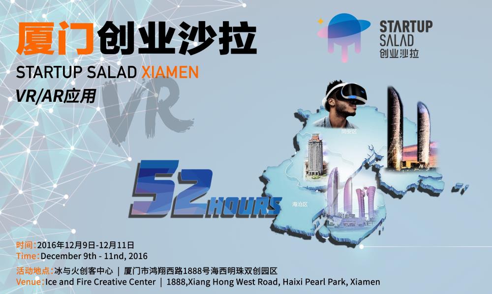 12月9日-12月11日期間,VR/AR應(yīng)用專題“創(chuàng)業(yè)沙拉”將在廈門舉辦。這將是一場(chǎng)顛覆傳統(tǒng)的52小時(shí)“創(chuàng)業(yè)沙拉”活動(dòng),我們邀請(qǐng)從事或?qū)R感興趣的你、他、她來參加,用激情燃燒的52小時(shí)重拾VR夢(mèng)想,重燃創(chuàng)業(yè)激情,你會(huì)被新鮮火辣的idea包圍,見證思維的碰撞,不斷發(fā)現(xiàn)問題,然后通通解決!你將組建或加入一個(gè)“戰(zhàn)隊(duì)”,與和你一樣的實(shí)干小伙伴們奮戰(zhàn)到底,從0到1的創(chuàng)業(yè)快感等你來體驗(yàn)!