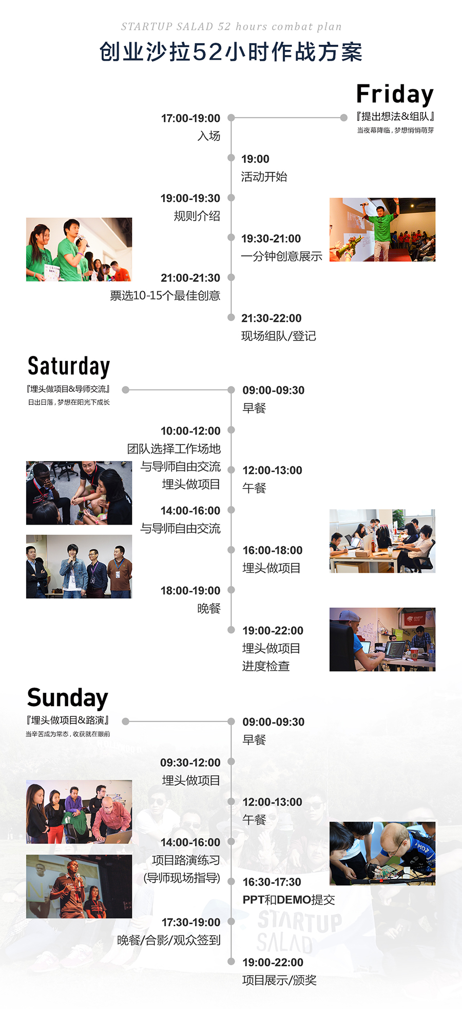 參與者手冊(cè):如果你想在周末有一個(gè)精彩的表現(xiàn),我們?yōu)槟銣?zhǔn)備了“52小時(shí)創(chuàng)業(yè)沙拉參與者手冊(cè)”(http://t.salad.co/)。里面包含了如何讓自己變強(qiáng)的秘笈哦!