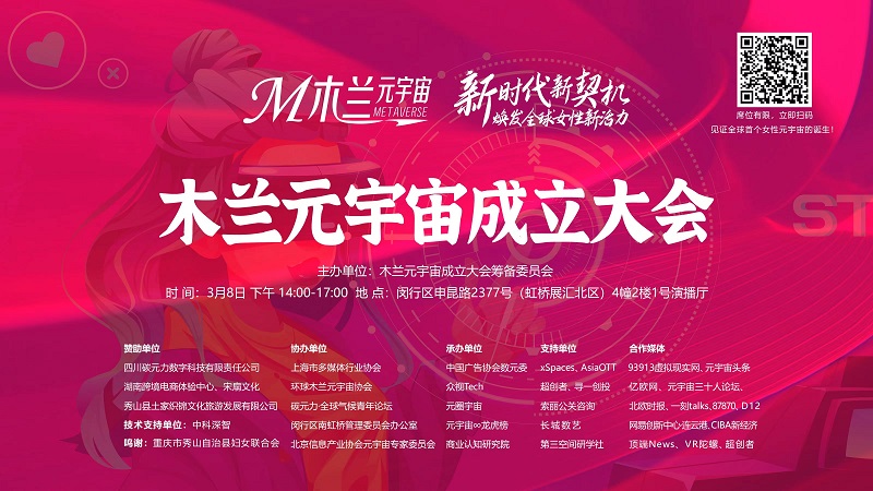 2023年3月8日,恰逢聯(lián)合國婦女權(quán)益和國際和平日來臨之際,“木蘭元宇宙”也正式落地成立!以“新時(shí)代新契機(jī),煥發(fā)全球女性新活力”為主題,以“線上線下融合、虛實(shí)智能互動、重磅榜單發(fā)布、產(chǎn)業(yè)深度研討”為亮點(diǎn),廣結(jié)國內(nèi)外元宇宙女性菁英及相關(guān)從業(yè)者,共同為產(chǎn)業(yè)發(fā)展、社會進(jìn)步、人類和平發(fā)聲、努力。