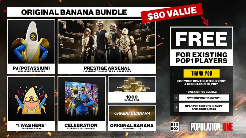 「Population: One」現(xiàn)有玩家(或在3月9日之前購買并體驗(yàn)了副本的玩家)將獲得“Original Banana Bundle”道具包作為補(bǔ)償,其中包括傳奇角色PJ(Potassium)、Prestige Arsenal(4個(gè)傳奇角色和 14把稀有槍支)、一個(gè)專屬噴漆、1000金幣等。