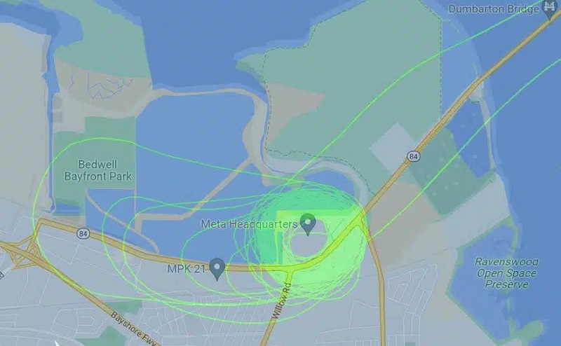 路線顯示,飛機(jī)先是環(huán)繞機(jī)場(chǎng)飛行,隨后前往了Meta總部,并在目的地上空不停盤旋直至當(dāng)天下午4點(diǎn)之前返回出發(fā)地。
