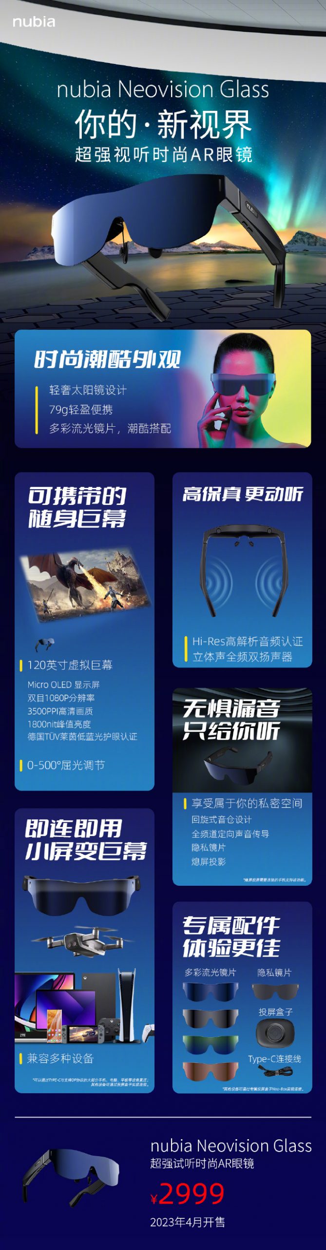3月7日,在努比亞Z50 Ultra新品發(fā)布會(huì)上,努比亞發(fā)布了智能AR眼鏡——nubia Neovision Glass,售價(jià)2999元,將于4月開(kāi)售。
