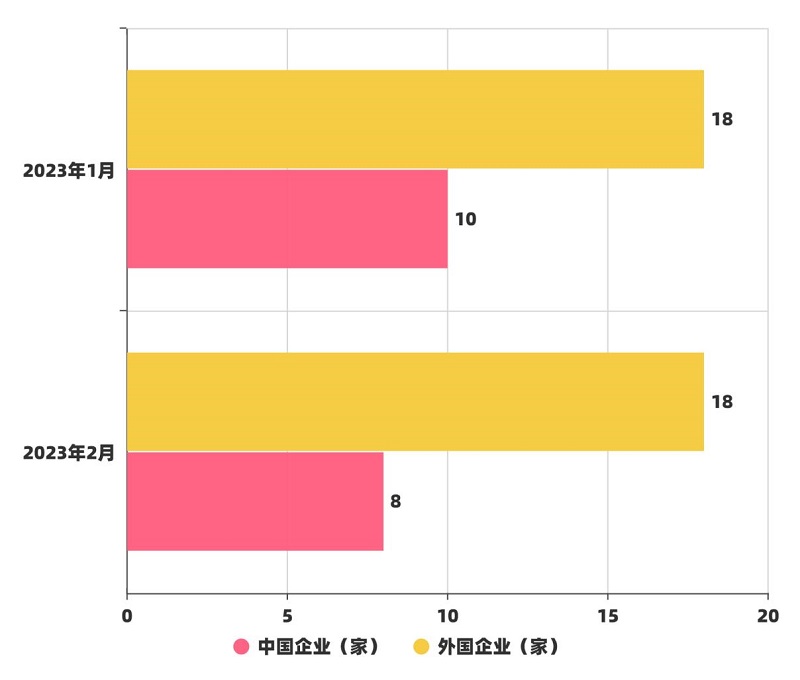 1月與2月國(guó)內(nèi)外投融資企業(yè)數(shù)量對(duì)比