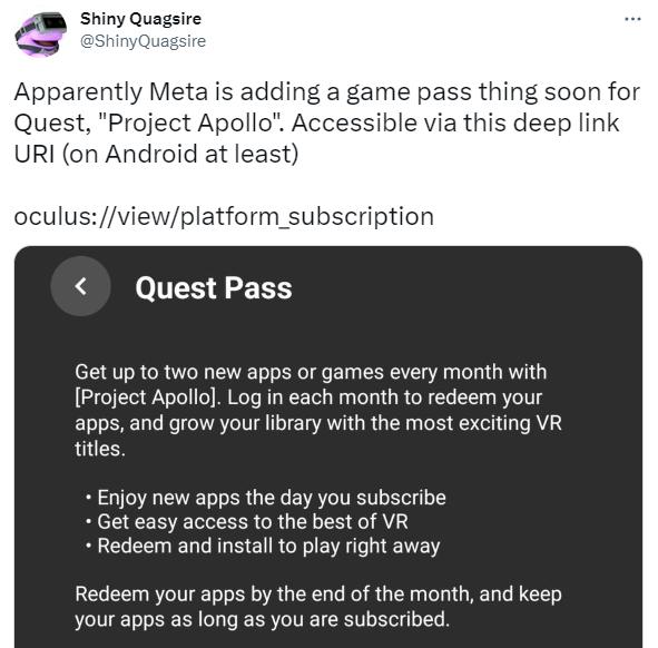 近日,Twitter用戶Shiny Quagsire發(fā)布了一張Meta Quest Android 應(yīng)用程序截圖,并聲稱通過深層鏈接看到了“Quest Pass”的描述。