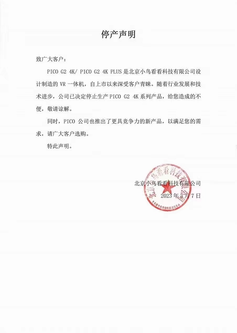 2023年3月7日,北京小鳥看看科技有限公司發(fā)布《停產(chǎn)聲明》,宣布公司已經(jīng)決定停止生產(chǎn)PICO G2 4K/PICO G2 4k PLUS(下簡稱PG2和PG2 PLUS)。