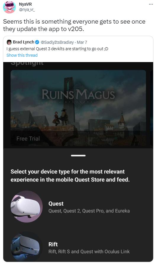 硬件分析師Bradley Lynch在其Twitter上發(fā)布了配套應用程序的屏幕截圖,其中顯示了一個設備選擇菜單,在Quest、Quest 2和Quest Pro之后是“Eureka”——這個代號在Quest固件中出現(xiàn)了很長一段時間,很可能是Meta Quest 3。