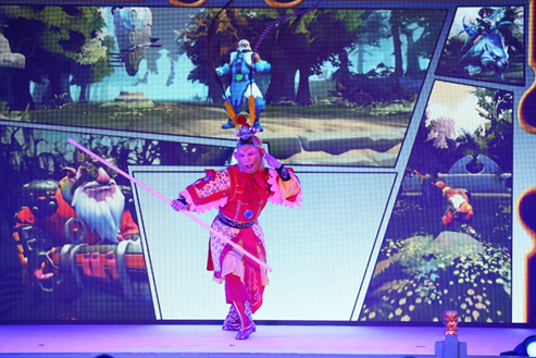 開(kāi)場(chǎng)表演別出心裁,高度融合了享有“中國(guó)國(guó)粹”之稱的京劇多媒體表演“新大鬧天宮”,讓到場(chǎng)嘉賓眼前一亮:齊天大圣孫悟空與眾多經(jīng)典電競(jìng)英雄,演繹了一場(chǎng)中國(guó)風(fēng)的電競(jìng)英雄風(fēng)云秀。其間,孫悟空與各路英雄展現(xiàn)了精彩激烈的廝殺打斗,“我不會(huì)向死亡低頭”、“散彈碎片”、“天降神勇”、“跑得了和尚跑不了廟”等電競(jìng)?cè)耸煜さ挠⑿蹖?duì)白不絕于耳,最終在如來(lái)佛祖的點(diǎn)撥下,相斗不如相助,他們結(jié)成同盟共赴2016國(guó)家杯。