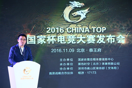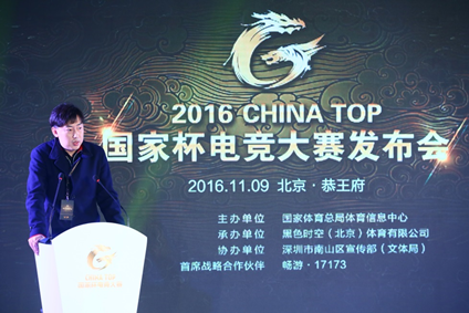 2016年11月9日,由國(guó)家體育總局體育信息中心主辦,黑色時(shí)空(北京)體育有限公司承辦,17173.COM作為首席戰(zhàn)略合作伙伴的國(guó)家級(jí)綜合性電子競(jìng)技賽事“2016 CHINA TOP•國(guó)家杯電子競(jìng)技大賽”在北京恭王府發(fā)布并舉行啟動(dòng)儀式,國(guó)家體育總局體育信息中心主任丁東、副主任李桂華,深圳市南山區(qū)委宣傳部部長(zhǎng)廖子彬,文化部恭王府管理中心副主任陳曉文,黑色時(shí)空(北京)體育有限公司董事長(zhǎng)秦袁,暢游CEO陳德文,創(chuàng)業(yè)公社執(zhí)行總裁丁磊和17173媒體群總經(jīng)理趙佳以及各路媒體代表共同出席發(fā)布會(huì)。
