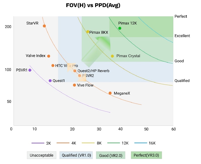 通過采用光學(xué)玻璃非球面透鏡,產(chǎn)品實(shí)現(xiàn)了更高的透光率,進(jìn)一步減少了雜散光,玻璃透鏡材質(zhì)替換樹脂材質(zhì),可將樹脂鏡片所能達(dá)到的85%-90%的透光率提升到接近100%,讓頭顯清晰度大幅提升。該頭顯也是VR史上第一款支持可更換透鏡的產(chǎn)品,用戶可通過更換透鏡,實(shí)現(xiàn)對清晰度和視場角的調(diào)節(jié),從而滿足不同場景下對PPD和FOV(Field of View,視場角)的差異化需求,在保持邊到邊無圖像畸變的情況下,最高可以實(shí)現(xiàn)高達(dá)42PPD的角分辨率,該參數(shù)也是目前所知的消費(fèi)級VR頭顯中已經(jīng)達(dá)到的最高角分辨率,已經(jīng)非常接近視網(wǎng)膜水平所需要的60PPD,而目前市場主流產(chǎn)品PPD僅為20左右。小派在發(fā)布會上表示,這是為了向VR愛好者提供一款“在清晰度上決不妥協(xié)”的頭顯。