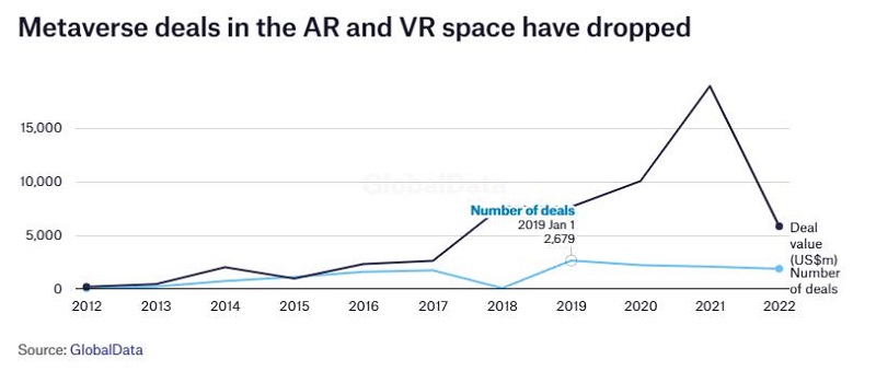 值得一提的是,GlobalData做出這些預(yù)測之際,元宇宙的兩項(xiàng)主要技術(shù)AR和VR的交易在2022年大幅下降。2022年,全球AR和VR領(lǐng)域投資總額為58億美元,涉及1910筆交易,比2021年的180億美元相去甚遠(yuǎn)。