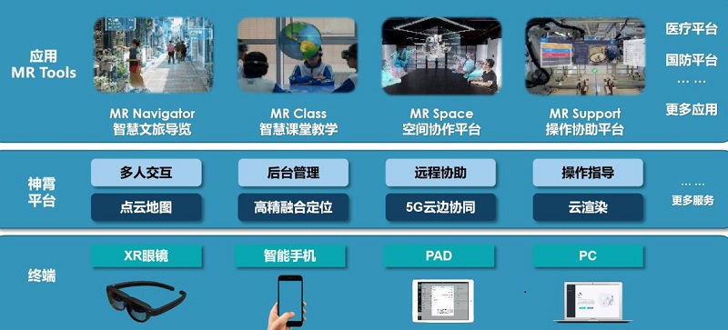 極赫科技成立后,主要以開發(fā)5G+MR場景的定制化項(xiàng)目為主,主要應(yīng)用于文旅、教育、工業(yè)等領(lǐng)域。2021年起,團(tuán)隊開始專注于開發(fā)“平臺化”產(chǎn)品,并于2022年8月AWE Asia現(xiàn)場正式發(fā)布了“神霄”平臺,為客戶提供高效的一站式零代碼XR場景創(chuàng)作工具平臺。“神霄”平臺作為一體化內(nèi)容生態(tài)平臺,以極赫的點(diǎn)云地圖、高精度融合定位、5G云邊協(xié)同、云渲染等核心技術(shù)為基礎(chǔ),為文旅、教育、工業(yè)等多個行業(yè)提供解決方案,如MR Navigator 智慧文旅導(dǎo)覽平臺、MR Class智慧課堂教學(xué)平臺、MR Space空間協(xié)作平臺、MR Support工業(yè)操作協(xié)助平臺等。