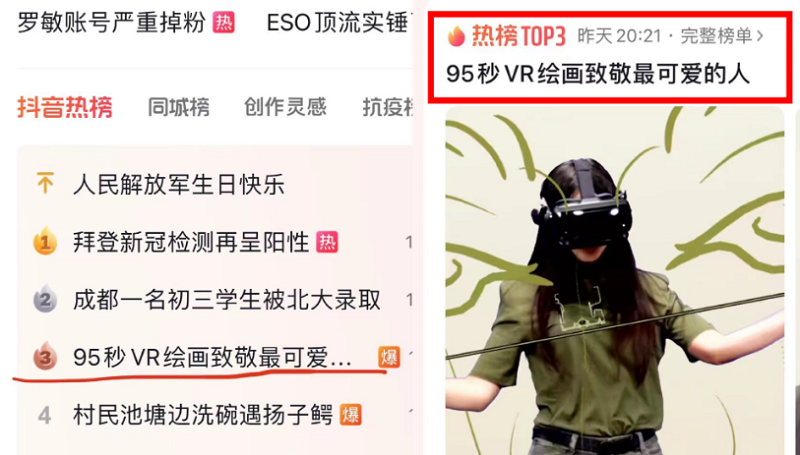 在這之后,她的作品和個人賬號都獲得了更多關注。她與CCTV4合作的端午主題作品,通過自己的賬號發(fā)布,在快手和抖音分別有數(shù)十萬點贊;與央視新聞合作的八一特輯作品,登上抖音Top3;與人民日報合作的迎接在韓志愿軍烈士遺骸歸國的VR畫作MV登上微博要聞Top3;與江蘇衛(wèi)視合作的跨年陣容猜想登上微博熱搜Top17……