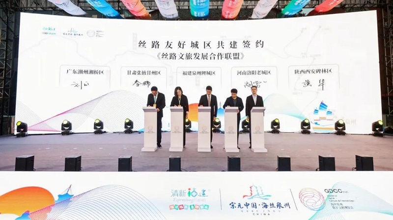 今年恰逢“一帶一路”倡議提出十周年,現(xiàn)場,福建泉州鯉城區(qū)、廣東潮州湘橋區(qū)、陜西西安碑林區(qū)、河南洛陽老城區(qū)、甘肅張掖甘州區(qū)等五個(gè)城區(qū)舉行絲路友好城區(qū)共建簽約,共同倡議組建絲路文旅發(fā)展合作聯(lián)盟。