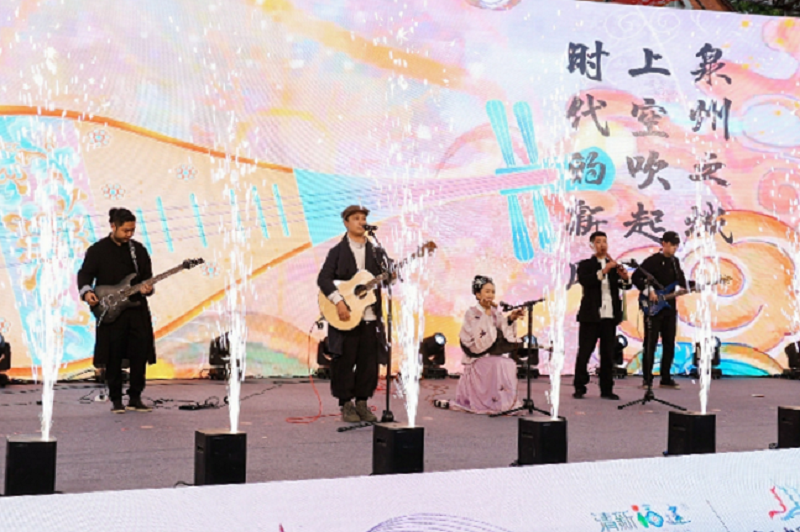 現(xiàn)場,“南音新勢力”獻(xiàn)唱大會主題曲《泉州意》,該曲由騰訊音樂制作