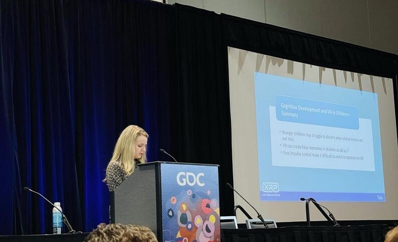 他們之前參與了許多與兒童、青年健康干預(yù)有關(guān)的XR項目,包括預(yù)防HIV/STI的多人VR游戲,預(yù)防電子煙的VR游戲,以及減少酒精危害的AR游戲等。在此次主題演講中,他們介紹了XRPeds關(guān)于VR對兒童認知發(fā)展和身體健康影響的研究,并針對VR發(fā)展過程中如何保護兒童給出了建議。