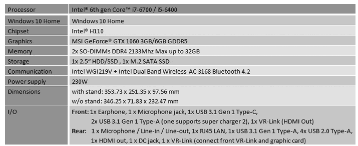 微星此次推出的VR-ready電腦外觀小巧硬朗。Trident提供了兩種處理器供玩家選擇i7-6700和i5-6400,顯卡方面也有兩種:3G的或者是6G的GTX 1060。內(nèi)存方面最高可支持到32GB DDR4 2133MHz,并提供一個(gè)M.2的固態(tài)硬盤(pán)和2.5英寸SATA存儲(chǔ)設(shè)備,讓玩家兼顧速度和容量。