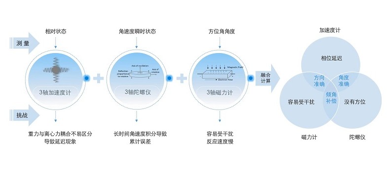 咸兌科技主要以九軸融合技術(shù)為核心,并進一步融合心率、GPS、壓力計、視覺和光電等其他傳感器,輸出本體智能感知方案。相較于以攝像頭、結(jié)構(gòu)光或者TOF為主的感知外部環(huán)境的技術(shù)方案,咸兌科技將本體智能感知方案做到更高精度,更低延遲,更低功耗,以及更低的算力要求。
