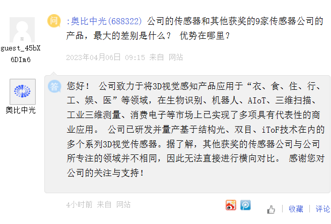 奧比中光在互動平臺表示,公司致力于將3D視覺感知產(chǎn)品應(yīng)用于“衣、食、住、行、工、娛、醫(yī)”等領(lǐng)域,在生物識別、機(jī)器人、AIoT、三維掃描、工業(yè)三維測量、消費(fèi)電子等市場上已實(shí)現(xiàn)了多項(xiàng)具有代表性的商業(yè)應(yīng)用。公司已研發(fā)并量產(chǎn)基于結(jié)構(gòu)光、雙目、iToF 技術(shù)在內(nèi)的多個系列3D視覺傳感器。
