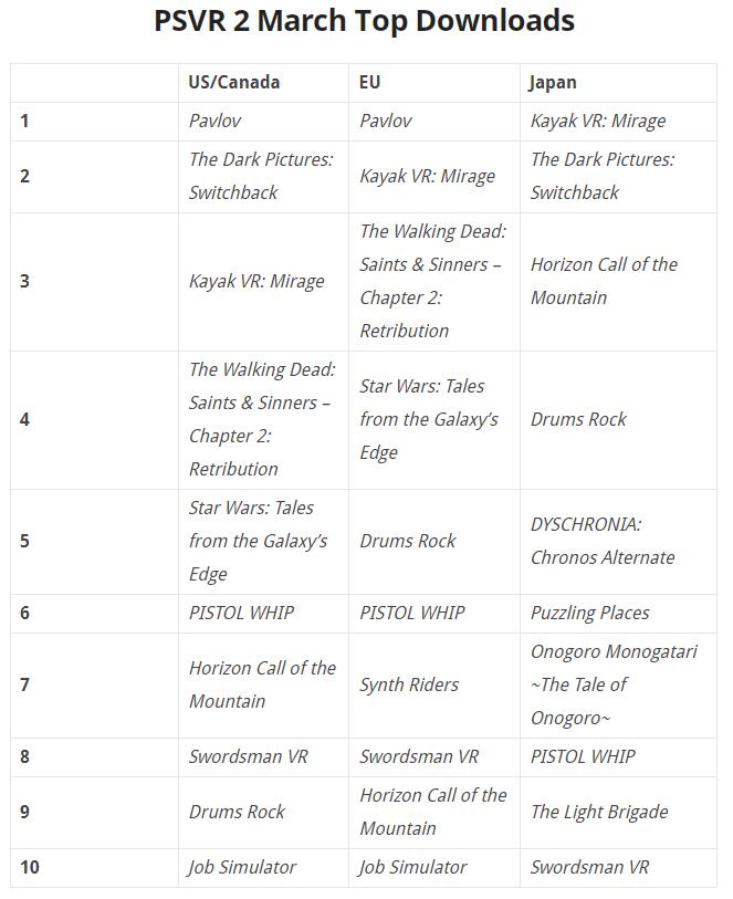 索尼發(fā)布了3月PS VR2游戲TOP 10下載榜單(數(shù)字版本,覆蓋美國(guó)、加拿大/歐盟/日本地區(qū))。