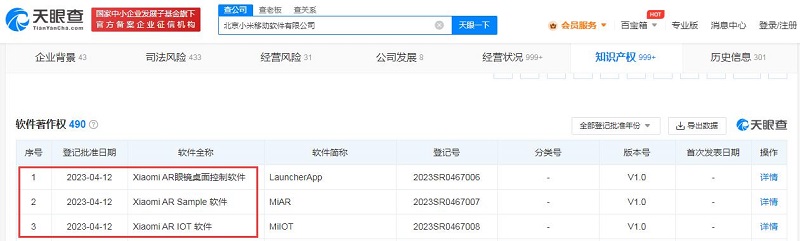 天眼查App顯示,北京小米移動(dòng)軟件有限公司“Xiaomi AR眼鏡桌面控制軟件”“Xiaomi AR Sample 軟件”“Xiaomi AR IOT 軟件”著作權(quán)獲登記批準(zhǔn),當(dāng)前版本號(hào)均為V1.0。