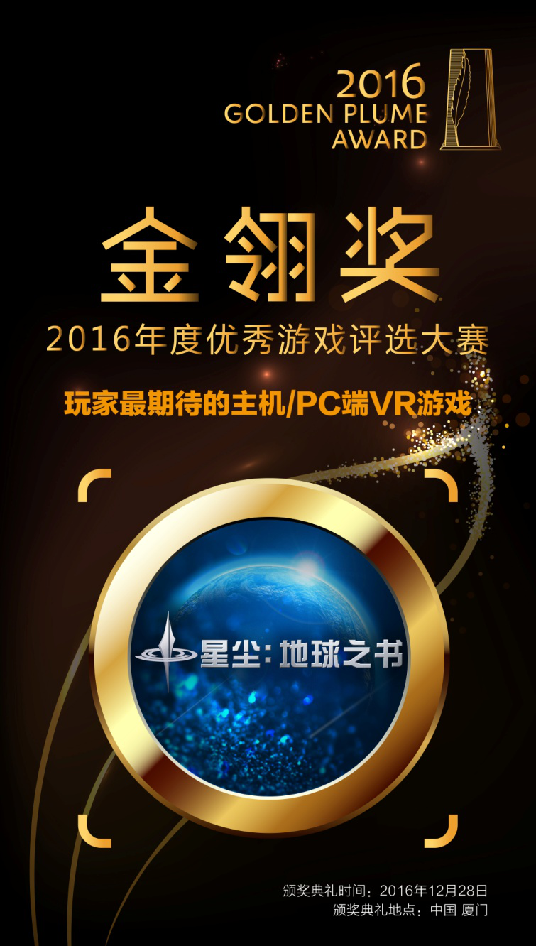 被譽(yù)為中國(guó)游戲產(chǎn)業(yè)的奧斯卡——“金翎獎(jiǎng)”,是中國(guó)游戲產(chǎn)業(yè)權(quán)威性最強(qiáng)、參評(píng)規(guī)模最大、媒體關(guān)注最高和政府支持力度最大的游戲評(píng)選活動(dòng),已經(jīng)連續(xù)舉辦了十屆。目前2016年度各獲獎(jiǎng)名單現(xiàn)已震撼公布,在如此激烈的角逐之下,由中影游聯(lián)合天鏡科技共同推送的旗下首款VR游戲《星塵:地球之書(shū)》(STARDUST:THE BOOK OF EARTH),榮膺2016年度金翎獎(jiǎng)『玩家最期待的主機(jī)/PC端VR游戲』獎(jiǎng)項(xiàng)!在此,衷心感謝每一位支持《星塵:地球之書(shū)》(STARDUST:THE BOOK OF EARTH)的玩家!
