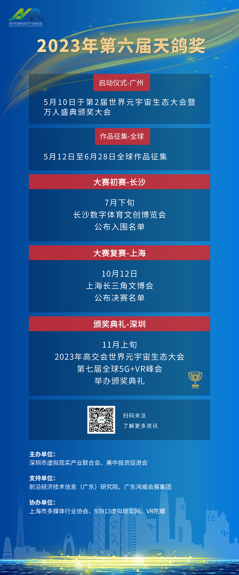 “天鴿獎(jiǎng)”是在國(guó)家工信部、深圳市人民政府指導(dǎo)下、由深圳市虛擬現(xiàn)實(shí)產(chǎn)業(yè)聯(lián)合會(huì)、美中投資促進(jìn)會(huì)、前沿經(jīng)濟(jì)技術(shù)信息(廣東)研究院主辦,多家行業(yè)學(xué)術(shù)、產(chǎn)業(yè)等知名機(jī)構(gòu)協(xié)辦,大象科創(chuàng)集團(tuán)和灣區(qū)元宇宙創(chuàng)新中心承辦,為助力科技創(chuàng)新應(yīng)用所特設(shè)的創(chuàng)新獎(jiǎng)項(xiàng)。天鴿獎(jiǎng)的寓意是指鴿子的“飛信傳書(shū)”功能,其命名體現(xiàn)了5G時(shí)代下元宇宙極具豐富內(nèi)容的核心宗旨,“天鴿獎(jiǎng)”已成功舉辦五屆,其中第二屆和第四屆頒獎(jiǎng)典禮分別在江西宜春和湖南長(zhǎng)沙舉行,已成為行業(yè)內(nèi)最具權(quán)威性和影響力的評(píng)選活動(dòng)之一。