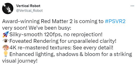 開發(fā)商西班牙游戲工作室Vertical Robot表示將“很快”發(fā)布「Red Matter 2」PS VR2版本,并在一條推文中指出,PS VR2版將具有平滑的120fps幀率,無重投影、具備注視點渲染功能、擁有4K重新制作的紋理和增強的照明。