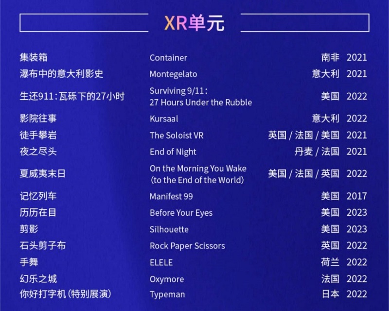 前面已經(jīng)提到,因?yàn)闀r(shí)間的緣故,我并沒(méi)有全部體驗(yàn)本屆展映單元的14部作品,在遺憾的同時(shí),我自己也度過(guò)了一個(gè)美好而充實(shí)的下午。我體驗(yàn)的每部作品從不同的角度和維度都帶給我不小的震撼感,或是出奇的視聽效果,或是恍然大悟的劇情反轉(zhuǎn),或是在沉浸觀影環(huán)境下得到的某種情緒的放大,總之在我結(jié)束每部作品的體驗(yàn)之后,我都需要坐下來(lái)平復(fù)一下心情,緩解一下作品的“后勁兒”,而這或許就是我沒(méi)能體驗(yàn)完所有作品的一個(gè)重要原因。在此我也列出了本屆展映單元的全部14部作品,為想要前來(lái)體驗(yàn)的觀眾朋友做一個(gè)參考。