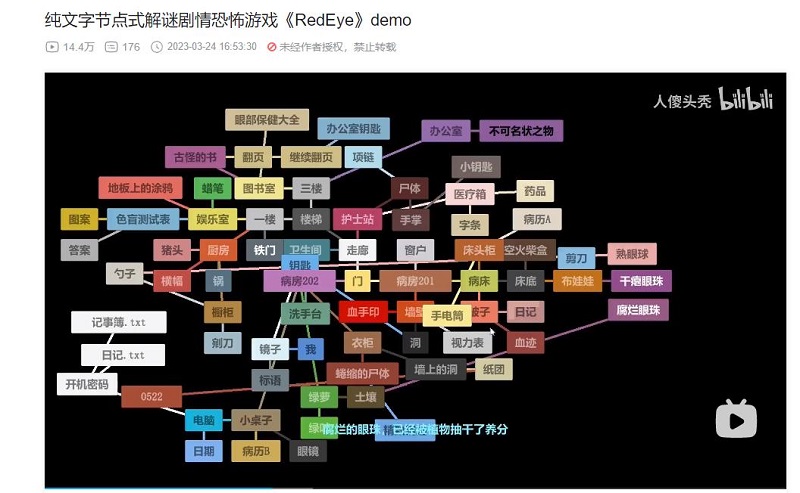 根據(jù)該視頻的UP主也就是游戲制作者“人傻頭禿”的描述,這款游戲的靈感來自于日本開發(fā)者的游戲「Nodes」?!窷odes」是由一名叫做巖崎的制作人使用Unity獨立開發(fā)制作的,游戲短小卻很獨特,曾在Youtube上被眾多知名游戲主播進行直播游玩。雖然「RedEye」的靈感和玩法都借鑒自「Nodes」,但其大致劇情及部分文本則是由ChatGPT生成的。