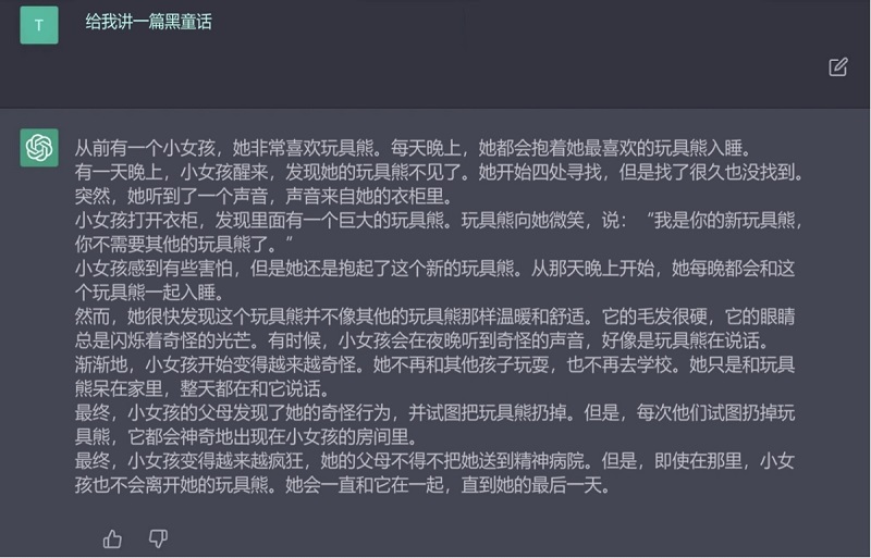 首先我決定讓ChatGPT幫我寫一個故事。童話故事是一個很好的題材,畢竟它適合所有人閱讀。然而我又不希望ChatGPT從現(xiàn)有的童話故事中挑選一個給我,于是我增加了一點額外的要求——講一個黑童話。下面就是它所創(chuàng)作出來的故事內(nèi)容: