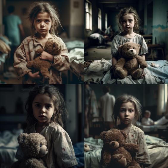 可以看出Midjourney成功提取了大部分信息,生成出來的圖片十分真實,破敗的精神病院中女孩抱著泰迪熊,或憂郁或面無表情的看著鏡頭。無論是人物的頭發(fā)還是衣物表現(xiàn)都十分完美,女孩與背景的反差也令人心生憐憫。盡管每張畫面上多多少少還是會有一些瑕疵,但如果對外行人聲稱這是一張“攝影作品”也足以蒙混過關(guān)。