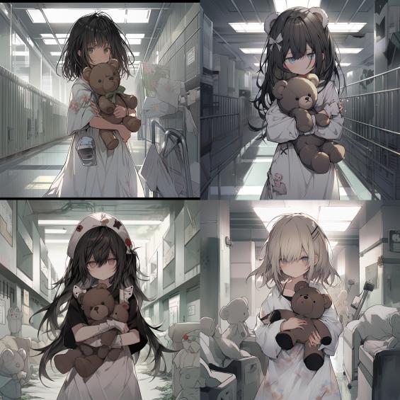 接著,我再將故事中出現(xiàn)的女孩信息進行提取和總結(jié),梳理出如下描述:“穿著病號服的小女孩抱著玩具熊,玩具熊很詭異,小女孩頭發(fā)凌亂,表情瘋狂,周圍昏暗、不詳,背景是精神病院的病房。”