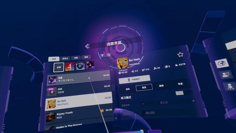 游戲的前期操作并無太多可說之處:選擇喜歡的曲目及其對應的難度,然后請開始你的表演!作為一款VR音游,「閃韻靈境」在手部操作上和以「節(jié)奏光劍」為代表的同類產(chǎn)品類似,不過不同于「節(jié)奏光劍」在擊打方塊時需要輸入八個方向(上/下/左/右/左上/右上/左下/右下),「閃韻靈境」的手部擊打區(qū)域?qū)⒁粋€圓形均勻切分為十塊,也就是街機音游玩家所熟知的“洗衣機模式”。雖然角度增大,不過這種模式更利于玩家記住應該打擊的位置。而且游戲中的節(jié)奏方塊不區(qū)分擊打方向,這點進一步降低了游戲難度,也增加了游戲自由度。