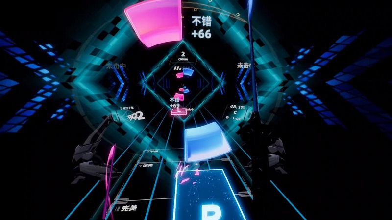 不得不說,「閃韻靈境」針對追蹤器開發(fā)的地面音符玩法非常有趣,我跟著音樂節(jié)奏進行全身運動的感覺十分良好,有時候感覺自己手腿不協(xié)調(diào)的窘態(tài)也算是一種全新的體驗(更不要說這種姿態(tài)在旁觀的人眼里會是什么樣子)。這里我衷心希望,伴隨著未來持續(xù)的更新,游戲及追蹤器的準確度能夠不斷提升。同時我個人也非常期待部分曲目可以推出單純的地面模式,畢竟如果能在VR游戲中享受昔日游玩跳舞機的樂趣,相信也一定會吸引更多新玩家加入。