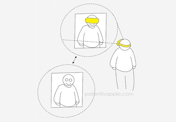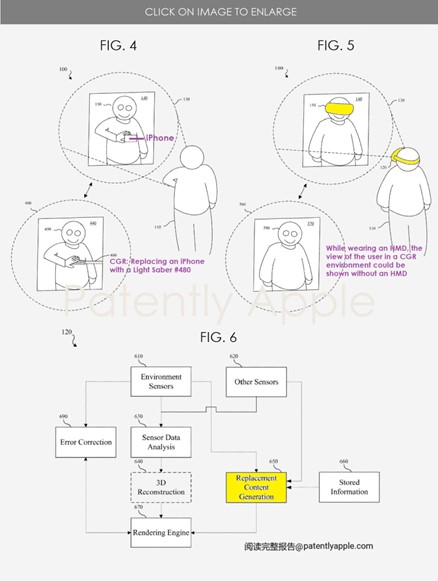 在蘋果的專利圖4和圖5中,我們看到蘋果將如何讓用戶在現(xiàn)實世界中持有的設備轉變?yōu)榱硪粋€設備,就像CGR環(huán)境中的光劍。在圖5中,雖然在現(xiàn)實世界中用戶戴著HMD,但在CGR環(huán)境中,HMD被替換成沒有佩戴HMD的用戶的臉。