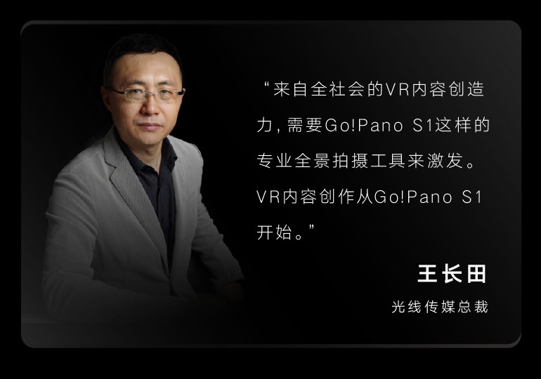光線傳媒總裁王長(zhǎng)田這樣評(píng)價(jià)Go!Pano S1:“來(lái)自全社會(huì)的VR內(nèi)容創(chuàng)造力,需要Go!Pano S1這樣的專(zhuān)業(yè)全景拍攝工具來(lái)激發(fā),VR內(nèi)容創(chuàng)作從Go!Pano S1開(kāi)始。”