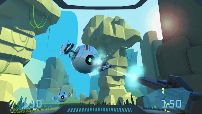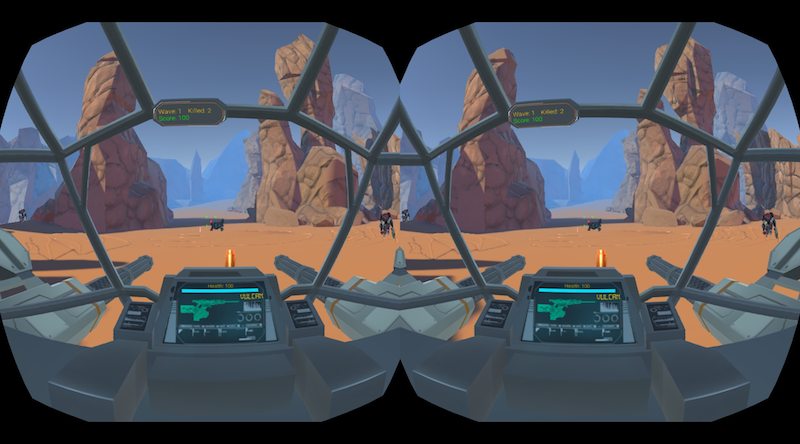 合金貓的團(tuán)隊(duì)人數(shù)雖然不多,但其作品的風(fēng)格和創(chuàng)意卻十分出色。之前我玩過(guò)的《X-Space》是一款移動(dòng)VR游戲,玩家通過(guò)頭控操作一臺(tái)機(jī)甲,在遙遠(yuǎn)的外星球與敵人作戰(zhàn),雖然頭控射擊的方式我已經(jīng)見(jiàn)過(guò)很多,但那種濃濃的卡通加科幻的風(fēng)格卻讓我非常喜歡。