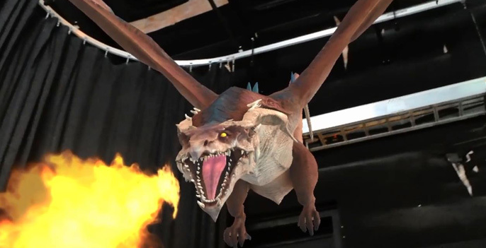 微軟把挑戰(zhàn)拍攝場(chǎng)地放在平常拍攝HoloLens混合視頻的綠幕工作室中,從拍攝視頻中我們看到,正在工作的職員仿佛時(shí)間靜止一動(dòng)不動(dòng),隨著畫面的移動(dòng),你將看到不同于一般的人體模型挑戰(zhàn),微軟利用HoloLens為這些人加入了全息元素,如職員拋出的餡餅、施展的魔法、睡覺的骷髏、拿劍的盔甲戰(zhàn)士以及噴火的飛龍,這些全息影像與人的表情和動(dòng)作結(jié)合相當(dāng)協(xié)調(diào)。而這些虛擬元素與現(xiàn)實(shí)相結(jié)合,微軟稱他們的版本為“混合現(xiàn)實(shí)版”。