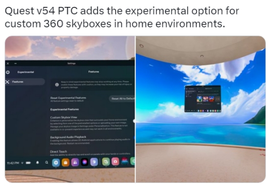 目前,自定義天空盒功能是否包含在下一次固件更新中尚不清楚。除了該功能,Meta還在測(cè)試背景音頻播放,基于該功能用戶可以在VR應(yīng)用中收聽YouTube和Spotify。