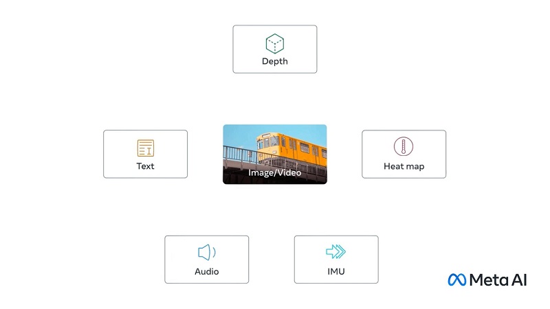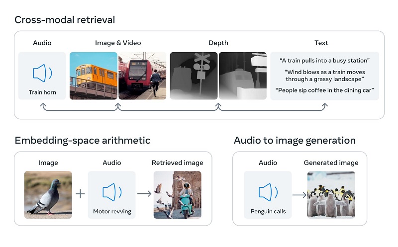 在典型的人工智能系統(tǒng)中,每個模態(tài)都有特定的嵌入(即可以表示數(shù)據(jù)及其在機器學(xué)習(xí)中關(guān)系的數(shù)字向量)。ImageBind可以跨多種模態(tài)創(chuàng)建聯(lián)合嵌入空間,而無需使用每種不同模態(tài)組合對數(shù)據(jù)進行訓(xùn)練。這一點很重要,因為研究人員無法創(chuàng)建包含來自城市街道的音頻數(shù)據(jù)、熱數(shù)據(jù)、深度數(shù)據(jù)、海邊懸崖文本描述等樣本的數(shù)據(jù)集。