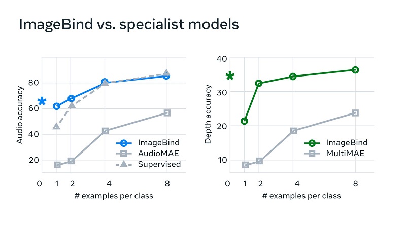 基于基準測試,ImageBind在音頻和深度方面優(yōu)于專業(yè)模型。我們發(fā)現(xiàn)ImageBind特征可用于少鏡頭音頻和深度分類任務(wù),并且可以勝過為這些模式量身定制的先前方法。例如,ImageBind明顯優(yōu)于Meta在Audioset上訓(xùn)練的自監(jiān)督AudioMAE模型和在音頻分類上微調(diào)的監(jiān)督AudioMAE模型,在≤四次分類上的top-1準確度提高了大約40%。