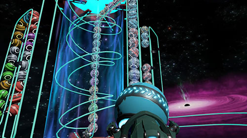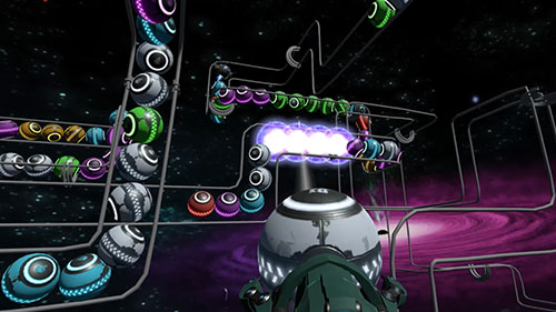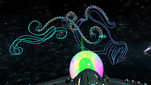 在Vive版本的《星際粉碎》中,玩家?guī)项^顯即可看到眼前或環(huán)繞在自身周圍的立體軌道。同時,手柄會變成一把太空槍,用于瞄準射擊。而在Oculus版本中,游戲的基本玩法并未發(fā)生太大的變化。雖然Oculus預(yù)計將于今年12月份發(fā)售Oculus Touch。但是現(xiàn)階段,在沒有Touch的情況下,將Vive的手柄瞄準完美移植到Oculus的頭盔瞄準便十分重要,尤其是要考慮瞄準射線與頭盔的綁定和同步率等問題。