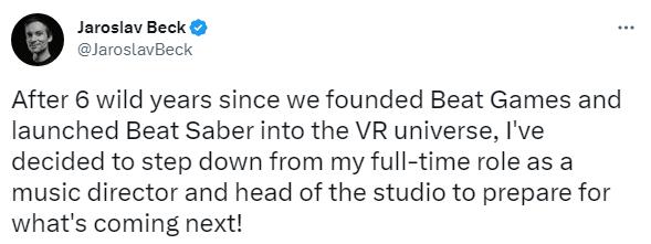 Jaroslav Beck在一條推文中宣布了這一消息,稱他離開是為了“為接下來的事情做準(zhǔn)備”。在Facebook的一篇較長帖子中,Beck表示“對圍繞 [ Beat Saber ] 和VR的玩家社區(qū)感激不盡?!?并澄清,他做出這個決定是因?yàn)槌酥谱饕魳?,最喜歡的是“啟動和加速具有全球雄心的尖端項(xiàng)目”。