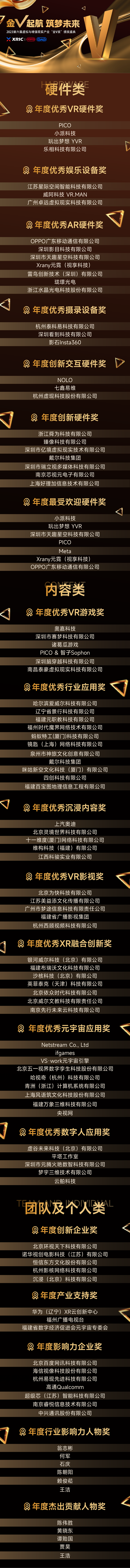 在本場活動(dòng)的頒獎(jiǎng)典禮環(huán)節(jié),萬眾矚目的第六屆「金V獎(jiǎng)」評(píng)選結(jié)果終于塵埃落定!現(xiàn)場進(jìn)行了震撼人心的頒獎(jiǎng)儀式,硬件類、內(nèi)容類、團(tuán)體及個(gè)人類三大類共19個(gè)獎(jiǎng)項(xiàng)的獲獎(jiǎng)結(jié)果最終揭曉,頒獎(jiǎng)嘉賓們?cè)陬C獎(jiǎng)現(xiàn)場對(duì)2023年度XR及元宇宙行業(yè)優(yōu)秀企業(yè)、產(chǎn)品以及為行業(yè)做出貢獻(xiàn)的杰出團(tuán)體和人物進(jìn)行了表彰。