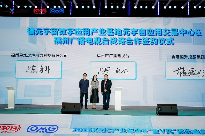 主旨演講環(huán)節(jié)結(jié)束后,大會(huì)舉行了福元宇宙數(shù)字應(yīng)用產(chǎn)業(yè)基地、元宇宙應(yīng)用交易中心&福州廣播電視臺(tái)戰(zhàn)略合作簽約儀式。福州廣播電視臺(tái)黨委書記、臺(tái)長陳航,香港恒升控股集團(tuán)總經(jīng)理顏愛汀,以及93913&OmgXR創(chuàng)始人/CEO陳科作為各方代表完成了現(xiàn)場簽約。