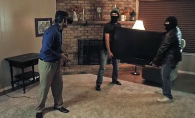 短劇始于一個(gè)中年男子下班后匆忙離開他的辦公室,心急回家的他原來是為了玩心愛的Oculus Rift頭顯。站到客廳中間,帶上頭顯,我們看到這家伙很快便沉浸到虛擬世界中,并長(zhǎng)時(shí)間地玩了起來。過了一段時(shí)間,兩個(gè)竊賊進(jìn)入了這家伙的房子并開始搬走他的東西,然而這家伙全然不知,繼續(xù)愉快的玩著他的游戲,等他回到現(xiàn)實(shí)的時(shí)候蒙了,家已經(jīng)被搬空了。